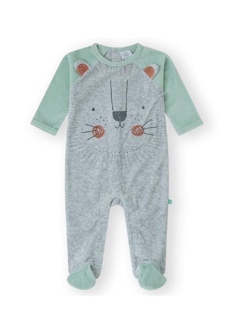 Pijama bebé tundosado con cuello redondo, abertura trasera y en entrepierna mediante corchetes y estampado de león con apliques a modo de orejitas en la parte delantera.