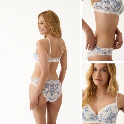Conjunto de sujetador con ligero relleno y tirantes regulables con pieza para cruzar en la espalda. Braga bikini a juego.