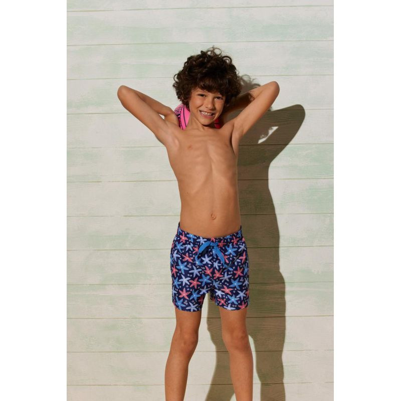 Bañador infantil de secado rápido. Estampado de estrellas de mar sobre un fondo azul marino. En la cintura tiene cordón para un mejor ajuste. Suspensor interior en suave malla para un confort total.