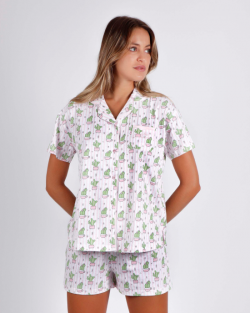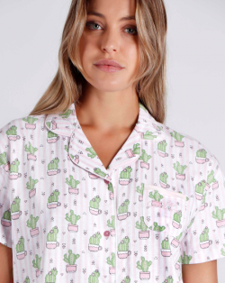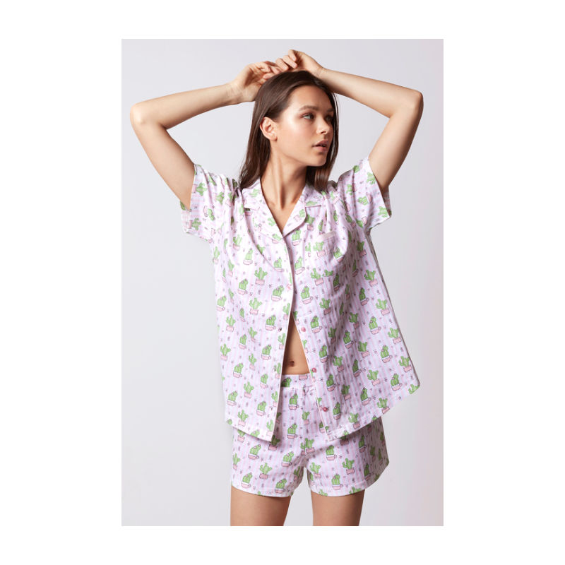 Pijama de mujer con pantalón corto estampado CACTUS y camiseta de manga corta estampada abierta con botones.