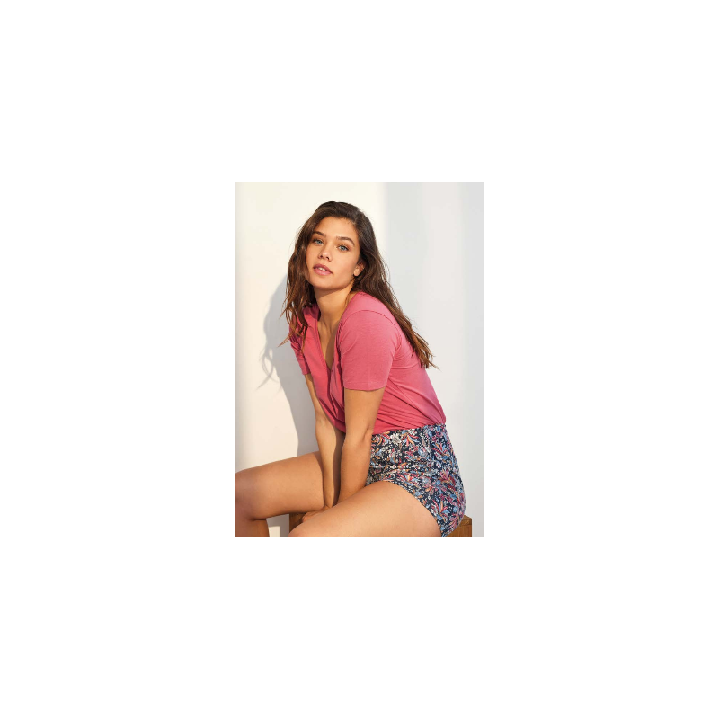 Pijama de mujer con patalón corto estampado, bolsilos laterales y goma en la cintura. Camiseta de manga corta básica escote en pico.