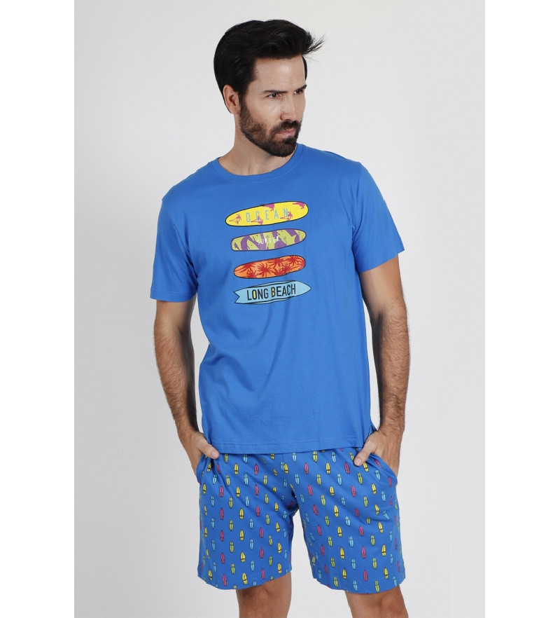 Pijama de punto de algodón, de manga corta, cuello redondo y pantalón corto. Camiseta con temas SURF.